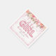 Mignonnes serviettes en baby shower de fille avec un arrière - plan blanc simple, élégante parties scintillant scintille & confetti, jolies fleurs d'aquarelle rose, le dicton "c'est une fille", le nom de la future maman, et la date de la célébration.