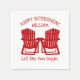 Laissez le plaisir commencer par ces chaises Adirondack amusantes, serviettes de retraite en rouge et blanc. Modifiez le texte pour n'importe quelle occasion.
