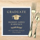 Serviettes de fête de fin d'études bleu foncé élégantes avec un chapeau de diplômé or, "Diplômé" et le nom du diplômé, de l'école et de l'année de promotion en typographie serif classique.