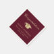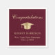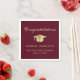 Serviettes de fête de fin d'études bordeaux élégantes avec un chapeau de diplômé en or, « Félicitations » dans un script de calligraphie classique et le nom du diplômé, l'école et l'année de promotion en typographie moderne.