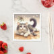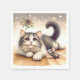 Un chat moelleux à l'aquarelle avec de grands yeux se trouve sur un plancher en bois, regardant la pointe de la souris suspendue au-dessus avec une souris à proximité