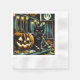 Serviettes en papier pour la fête d'Halloween. Chat noir assis sur un porche avant à côté d'un citrouille sculpté avec une pleine lune dans l'arrière - plan.
