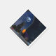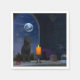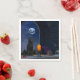 Un mignon chat noir est assis sur une table en regardant une bougie éclairée. Sur la table se trouvent également un livre, un gobelet, une bouteille, un coffre, un casquette et une boule de cristal avec un corbeau assis sur le dessus. Une pleine lune brille dans la fenêtre sur la scène.