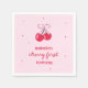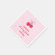 "Cherry first birthday" themed birthday napkins with illustrated cherries tied with a pink preppy bow, and adorable handwritten fonts.