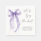 Élégantes serviettes pour votre mariage avec une illustration peinte à la main représentant un nœud coquette violet, "Elle noue le nœud" dans un script calligraphique chic, et le nom de la mariée et la date du mariage en lettrage moderne simple.