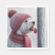 Un chien blanc moelleux dans un casquette tricoté rouge et foulard a sa langue collée à un poteau métallique gelé pour Noël.