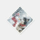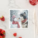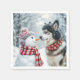 Un chien coquin et un bonhomme de neige se font face, entourés d'un paysage enneigé
