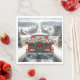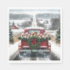 Un vieux camion rouge décoré d'une couronne festive transporte un groupe de chiots Golden Retriever à travers la campagne enneigée