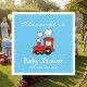 Serviettes de baby shower personnalisées avec mignon train choo rouge. Modèle de locomotive jouet coloré avec date de naissance ou de célébration. Illustration d'un véhicule pour enfants adorable. Créez vos propres serviettes de douche avec du texte personnalisable. Dans le rose clair pastel violet jaune gris bleu etc. Idée sympa pour maman nouvelle, mère à être. Aussi amusant pour les enfants 1er anniversaire fête.