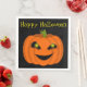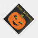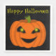 Citrouille orange avec un visage souriant et des yeux jaunes lumineux. Modèle ci-dessus avec le texte "Joyeux Halloween". Fond noir.