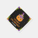 Adorable citrouille orange avec une corne de licorne d'or et un casquette de sorcières violettes. L'arrière - plan noir a des confettis d'Halloween orange, jaune, vert et violet, des fleurs florales et des feuilles dans les coins. Graphiques par PrettyGrafik