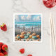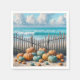 Une collection de citrouilles orange et turquoise sur une plage de sable encadrée par une barrière en bois patinée