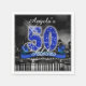 This classy cocktail napkin design features a giant, blue faux-glitter '50', script text 'Fabulous' and ribbon banner over a black and white photograph of a bright city skyline reflected on water. Search ID191 to see additional products with this design.