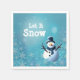 Laisser Neige 4.75x4.75 Papier Cocktail Napkin. Des flocons de neige éparpillés tombant sur un arrière - plan bleu airbrushed avec un bonhomme de neige mignon habillé en bleu. Le texte peut être modifié.