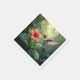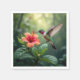 Un colibri vibrant plane à côté d'une fleur d'hibiscus en fleurs, ses ailes un flou de mouvement.