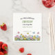 This “Our Little Wildflower” first birthday Welcome napkin is designed with a soft white background and a lively arrangement of bright, whimsical wildflowers and delicate butterflies blooming across the bottom border. The title “our little wildflower” is styled in a fun serif font, paired with your little one’s name in a bold comic font that adds a playful touch, while the party details are displayed in a matching serif font for a balanced, joyful feel. The vivid floral colors create a fresh, happy look, Simple to edit and customize with all your celebration details.