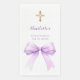 A white background color. Decorated with a large lavender colored bow and a golden cross. Personalize and add the name and date.