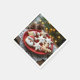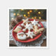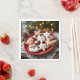 Les biscuits festifs en forme de Père Noël, rennes, étoiles et cloches sont disposés sur une plaque rouge avec dentelle grasse