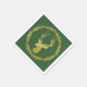Serviettes de Noël pour la saison des fêtes avec cerf d'or aux bois, avec couronne festive en vert foncé.