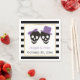 Crânes couples et rayures violet Halloween mariage serviette en papier. Un drôle de couple de crânes et une bordure rayée en rayures noir et blanc sont les principaux éléments de ce design mariage d'Halloween avec votre texte dans cadre blanc. Le marié a sur un casquette violet tandis que la mariée porte un arc violet.