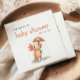These cute baby shower napkins feature a watercolor axolotl holding an umbrella in the rain, below the words "baby shower" in orange hand-printed font. Personalize the text with the name of the mom-to-be and the date in charcoal gray sans serif.