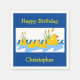 Image mignonne de canards ou d'une famille de canards en caoutchouc jaune, y compris les enfants. Un thème amusant pour les enfants, filles ou garçons. Happy Birthday est écrit ci-dessus et personnalisé avec le nom de l'enfant ci-dessous ou tout libellé, ou supprimer pour laisser clair. Amusant pour les enfants pour toute occasion. Montré sur un arrière - plan bleu ou changez en blanc ou en toute couleur. Votre choix de styles et de tailles de serviette - la conception de la note peut ne pas correspondre à tous les produits offerts.