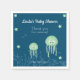 Mignonnes serviettes de baby shower décorées sur le thème de la mer pour vos vaisselle. L'illustration présente quelques méduses aux couleurs turquoise et quelques étoiles sur un arrière - plan bleu. Personnalisez le texte avec votre propre message. Illustré et dessiné par Patricia Alvarez.