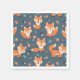 Serviettes en papier avec un motif fait de renards orange mignons et heureux. Arrière - plan vert foncé. Petits champignons et feuilles parsemés.