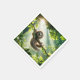 A cute sloth hangs from a tree branch surrounded by lush green leaves, with sunlight streaming through the canopy