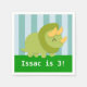 Vous planifiez une fête d'anniversaire à thème dinosaure pour les enfants ? Considérez cela comme des fournitures de fête qui aident à décorer la fête ! Design a un Tricératops mignon, vert et jaune avec des pointes arrondies et des yeux souriants que vous ne pouvez pas résister à l'égrenage aussi. Arrière - plan de bandes verticales. Personnalisez avec un message de fête.