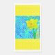 Cette serviette d'invité en papier arbore un collage numérique composé de plusieurs couches de peintures, de textures et de scans. La jonquille ensoleillée "apparaît" sur le fond bleu. Des pois jaunes et blancs joyeux forment un cadre en haut et en bas.