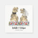 Parfait pour un mariage à thème dinosaure, ce marié et marié de dinosaures amusant, debout dans une serviette fleur sauvage colorée, ravira vos invités. Facile à customiser avec les noms des mariés et des mariés et la date du mariage dans le script de typographie moderne. Dinus amusant T-Rex dino marié et marié et aquarelle d'été illustrations florales en bleu violet vert jaune et orange teintes. Dino original unique et oeuvres d'art florales d'été de l'artiste Catherine Sweetman