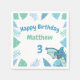 Un dragon de dinosaures mignon et des feuilles tropicaux en bleu et vert, une police moderne vous raconte l'âge de l'enfant avec le nom du garçon (ou de la fille) d'anniversaire. Nous avons des assiettes et des invitations assorties dans notre collection.