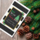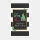 Eat, drink and be merry holiday party featuring a Christmas tree and gifts against a gold frame. Black and white striped background with holly