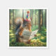 Un écureuil se tient dans une forêt éclairée par le soleil, portant un casquette de fête festif tout en tenant une carte d'anniversaire.