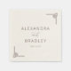 This wedding napkin features a minimalist design with a clean, white background and elegant black typography. The layout is centered, showcasing the names "Alexandra" and "Bradley" in uppercase letters, connected by a stylish cursive "and." Decorative geometric accents add subtle sophistication to the corners, enhancing the modern yet timeless aesthetic. Perfect for formal events, this design exudes understated elegance and is ideal for couples seeking a refined touch for their special day.