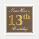 Cette conception simple et élégante de serviette en papier comporte un message comme "NameHere’s 13th Birthday" (le "13th" ayant une fausse couleur dorée) dans une zone carré de couleur marron avec un contour de bordure simple. Le nom est dans un texte de type script de couleur blanche, et peut être personnalisé. Des serviettes comme celles-ci pourraient être utilisées à une fête d'anniversaire pour quelqu'un qui célèbre son treizième anniversaire. [~Z0000139]
