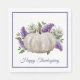 Des serviettes en papier à thème Thanksgiving avec une fine bordure violette autour du bord et de beaux graphismes d'un citrouille blanc et des fleurs violettes. Le texte violet lit le Bon thanksgiving et peut être personnalisé pour lire ce que vous voulez.