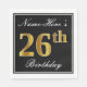 Cette conception simple et élégante de serviette en papier comporte un message comme "Nom-Voici 26e anniversaire" (avec le "26e" ayant un faux look de couleur or) dans une zone carré de couleur noire avec un contour de bordure simple. Le nom est dans un texte de type script de couleur blanche, et peut être personnalisé. Des serviettes comme celles-ci pourraient être utilisées à une fête d'anniversaire pour quelqu'un qui fête son vingt-sixième anniversaire. [~Z0000136]