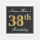 Cette conception simple et élégante de serviette en papier comporte un message comme "Name-Here’s 38th Birthday" (avec le "38th" ayant un faux look doré) dans une zone carré de couleur noire avec un contour de bordure simple. Le nom est dans un texte de type script de couleur blanche, et peut être personnalisé. Des serviettes comme celles-ci pourraient être utilisées à une fête d'anniversaire pour quelqu'un qui célèbre son trente-huitième anniversaire. [~Z0000136]