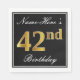 Cette conception simple et élégante de serviette en papier comporte un message comme "Nom - Voici le 42e anniversaire" (avec le "42e" ayant un faux look doré) dans une zone carré de couleur noire avec un contour de bordure simple. Le nom est dans un texte de type script de couleur blanche, et peut être customisé. Des serviettes comme celles-ci pourraient être utilisées à une fête d'anniversaire pour quelqu'un qui célèbre son quarante-deuxième anniversaire. [~Z0000136]