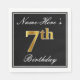 Cette conception simple et élégante de serviette en papier comporte un message comme "Name-Here’s 7th Birthday" (avec le "7th" ayant une fausse couleur dorée) dans une zone carré de couleur noire avec un contour de bordure simple. Le nom est dans un texte de type script de couleur blanche, et peut être personnalisé. Des serviettes comme celles-ci pourraient être utilisées à une fête d'anniversaire pour quelqu'un qui célèbre son septième anniversaire. [~Z0000136]