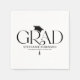 Celebrate your graduate with refined, modern style using these elegant graduation party napkins. Set against a chic white background, the design features the word “GRAD” in a modern serif typeface, with a stylish graduation cap icon positioned above the “R.” The end of the “R” flows seamlessly into a dangling tassel that runs through the graduate’s name, school, and class year for a cohesive, high-end look.
