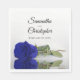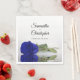 Ces magnifiques serviettes mariages ajouteront style et classe à votre réception, dîner de répétition ou autre événement mariage. Elles présentent un design simple mais élégant et romantique, avec un seul rose bleu royal ou cobalt à longue tige qui se reflète dans un bassin d'eau avec vagues et ondulations. Au-dessus du rose se trouvent les noms du couple et la date du mariage.