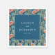 These wedding napkins feature an elegant design with a central navy blue rectangle bordered by a white line, showcasing sophisticated serif typography. Surrounding the text is a charming pattern of teal and green cacti adorned with pink flowers, creating a harmonious blend of natural motifs and modern aesthetics. The soft color palette and botanical elements evoke a warm, inviting atmosphere, perfect for celebrating special moments. Ideal for couples who appreciate both contemporary style and organic charm, these napkins add a touch of sophistication to any wedding setting.