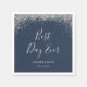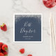 Elégante serviettes en papier mariage bleu marine et argent moderne avec écriture moderne et confettis argent brillant sur un arrière - plan bleu marine. Éléments correspondants disponibles.