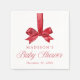 Celebrate the mom-to-be with these Christmas baby shower napkins featuring a red watercolor bow hanging from a ribbon. “Baby Shower” is displayed in elegant red calligraphy, creating a festive and timeless design perfect for a holiday baby shower celebration. These personalized napkins can be customized with the mom-to-be’s name and shower date, adding a charming seasonal touch to your table décor and coordinating perfectly with your Christmas baby shower theme.