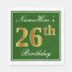 Cette conception simple et élégante de serviette en papier comporte un message comme "NameHere’s 26th Birthday" (le "26th" ayant une fausse couleur dorée) dans une zone carré de couleur verte avec un contour de bordure simple. Le nom est dans un texte de type script de couleur blanche, et peut être personnalisé. Des serviettes comme celles-ci pourraient être utilisées à une fête d'anniversaire pour quelqu'un qui fête son vingt-sixième anniversaire. [~Z0000137]