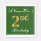 Cette conception simple et élégante de serviette en papier comporte un message comme "AnameHere’s 2nd Birthday" (avec le "2nd" ayant une fausse couleur dorée) dans une zone carré de couleur verte avec un contour de bordure simple. Le nom est dans un texte de type script de couleur blanche, et peut être customisé. Des serviettes comme celles-ci pourraient être utilisées à une fête d'anniversaire pour quelqu'un qui célèbre son deuxième anniversaire. [~Z0000137]