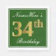 Cette conception simple et élégante de serviette en papier comporte un message comme "NameHere’s 34th Birthday" (avec le "34th" ayant une fausse couleur dorée) dans une zone carré de couleur verte avec un contour de bordure simple. Le nom est dans un texte de type script de couleur blanche, et peut être personnalisé. Des serviettes comme celles-ci pourraient être utilisées à une fête d'anniversaire pour quelqu'un qui célèbre son trente-quatrième anniversaire. [~Z0000137]